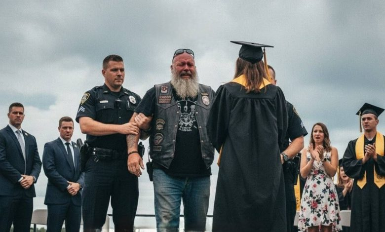 He stood there in his worn leather vest, stained with dirt and grease, surrounded by a sea of strangers—doctors, lawyers, professors—the kind of people he’d never dreamed of standing beside. In his trembling hands, he held a small gift—something I didn’t want from him, from the man I’d spent the last ten years pretending was dead. He was a ghost I’d buried long ago, one I swore I’d never face again.