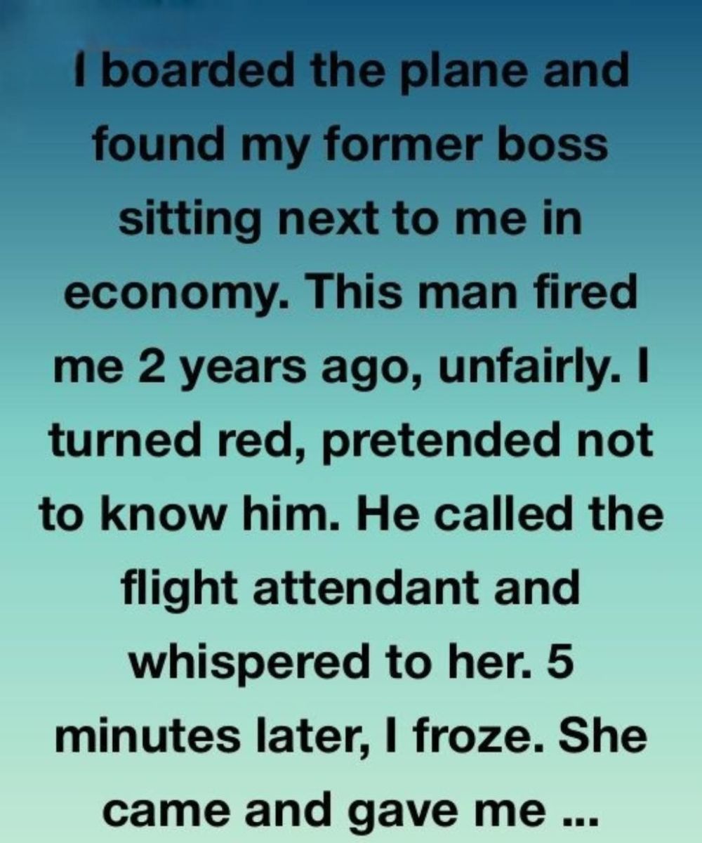 As I made my way down the narrow aisle, luggage bumping my leg, I looked up and froze. Sitting exactly where I was supposed to sit was the one person I least expected — my former boss. The same man who had fired me two years earlier, whose decision had sent my life spiraling into self-doubt.