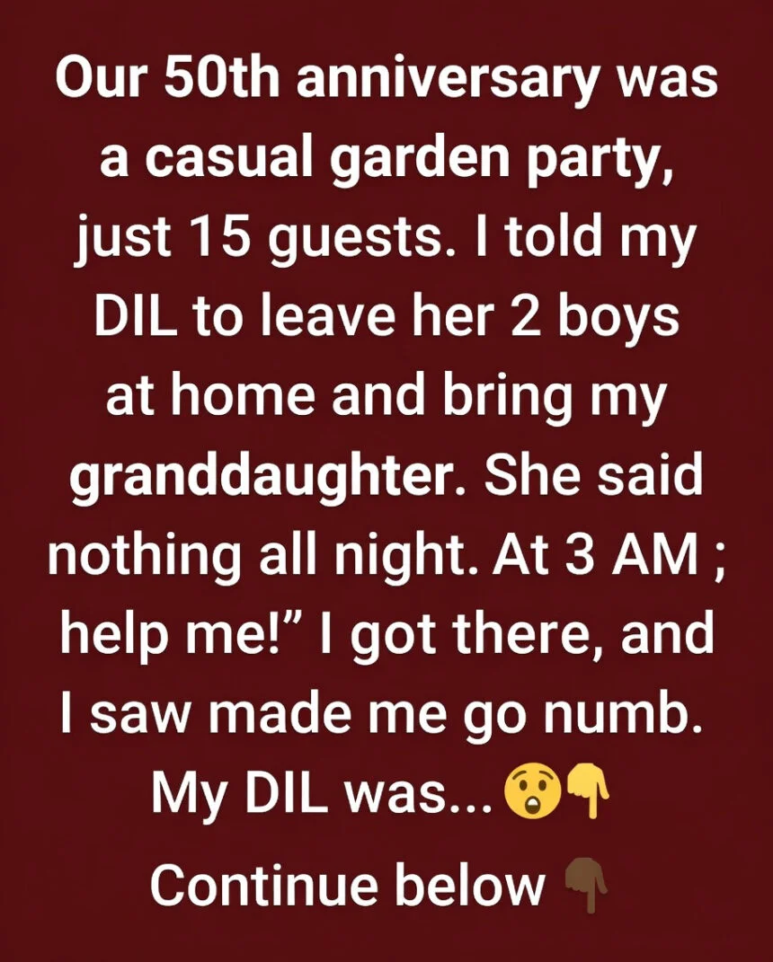Our 50th wedding anniversary was meant to be a simple garden party. Just fifteen guests, soft music, and warm lights strung between the trees. I had told my daughter-in-law to leave her two boys at home and bring my granddaughter instead.